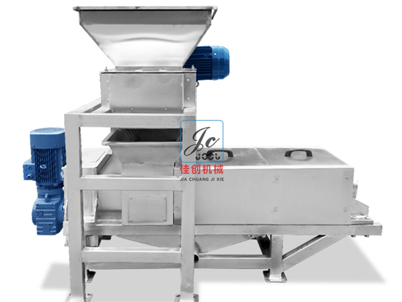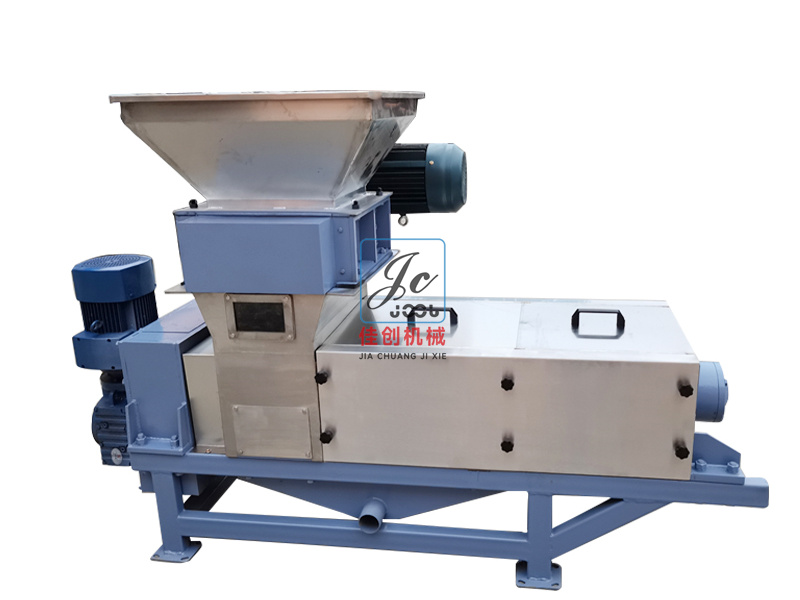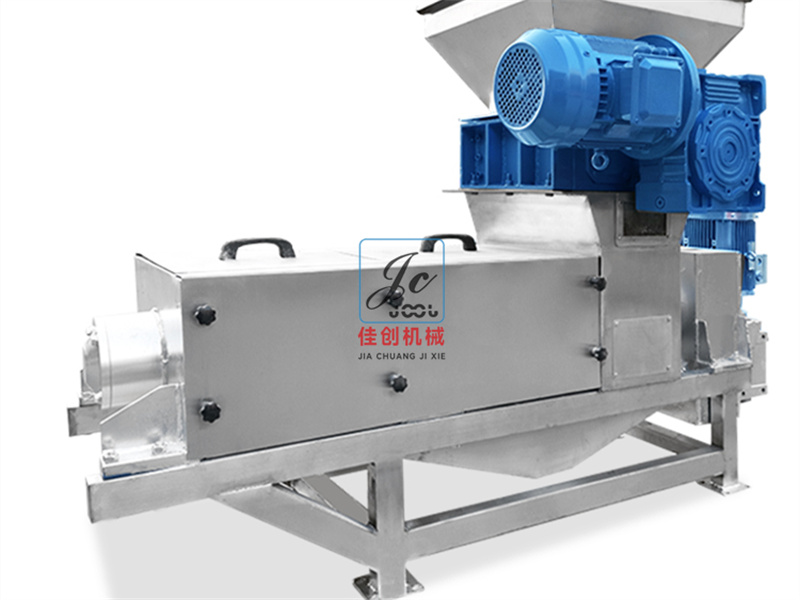 餐廚垃圾壓榨機中部設(shè)有進料箱,箱內(nèi)設(shè)有濾板。經(jīng)處理后的葡萄皮渣或果蔬送入箱內(nèi),即有部分汁液通過濾板自行流出;經(jīng)螺旋榨出的果蔬汁通過篩筒流進盛汁盤,再由出汁管流出;壓榨后的皮渣由篩筒末端的迫門排出。
